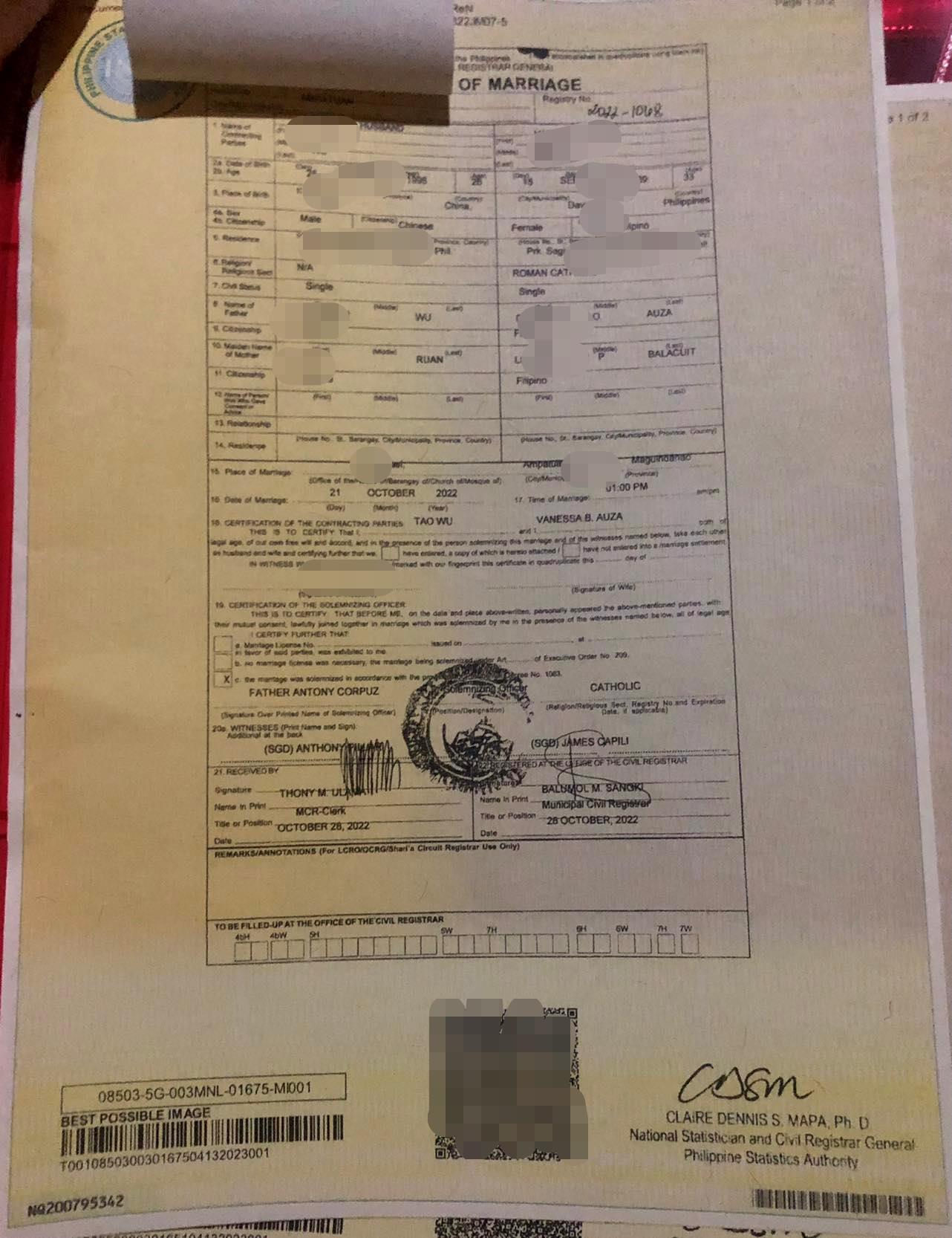 在这边已经停留两年时间了,想带菲律宾太太回国,由于旅游签对资料的信息比较严格,在网上找到华商签证以后,结婚证一天时间给我做好,这效率杠杠的