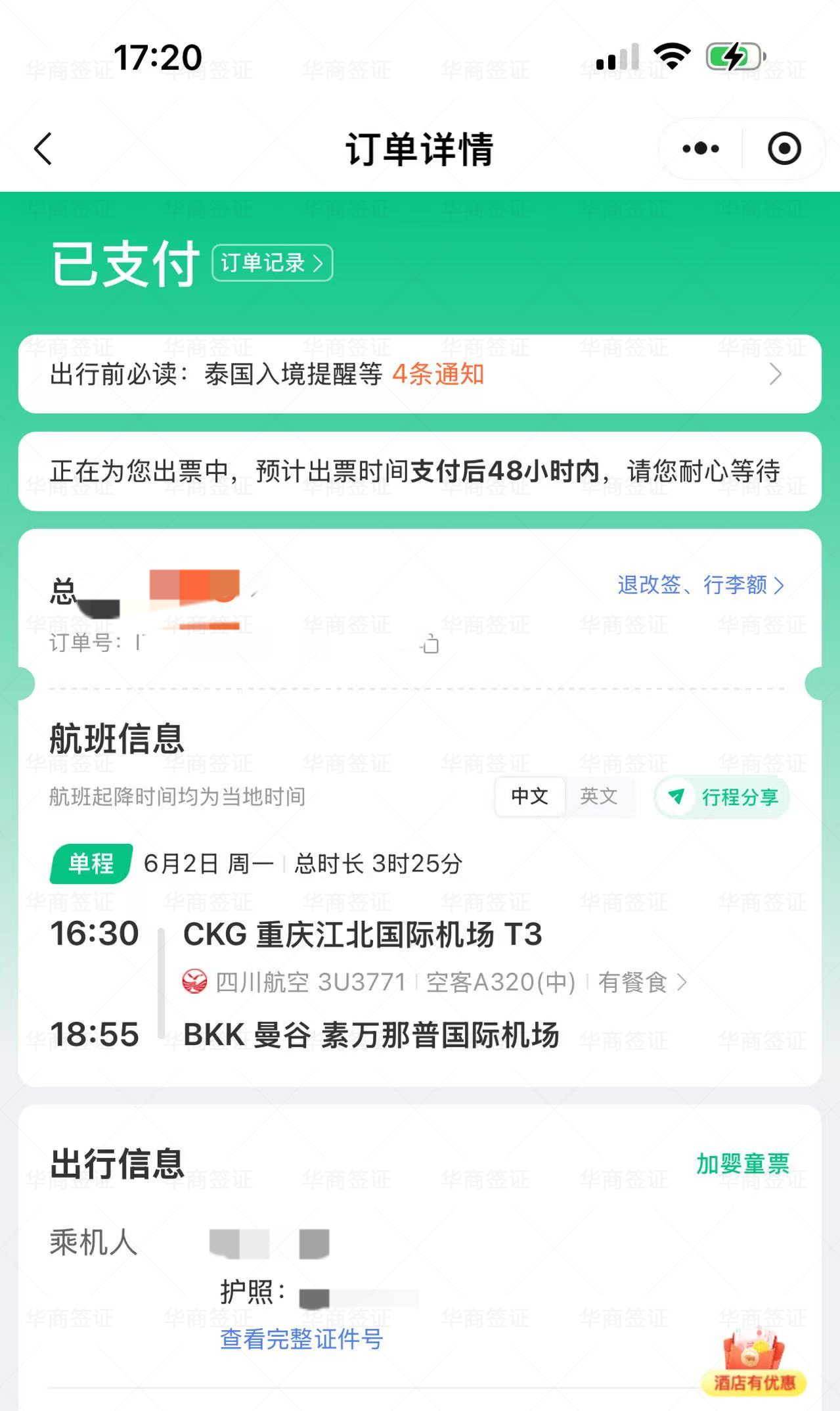 我跟我朋友两个的续签,我们俩是打算回国了但没法在原本的签证到期前走来不及,就找华商续了一个月,续到六月份,然后办ECC回国,好在续签和ECC 都办很快,又不贵还是挺值得的,不耽误什么事情,找华商帮忙续还不用自己处理就找个骑手把护照和之签续签单送过去等几天就行了,现在我们俩已经到国内了,忘了还没来评论现在才来评论,推荐大家有需要的都可以找他们