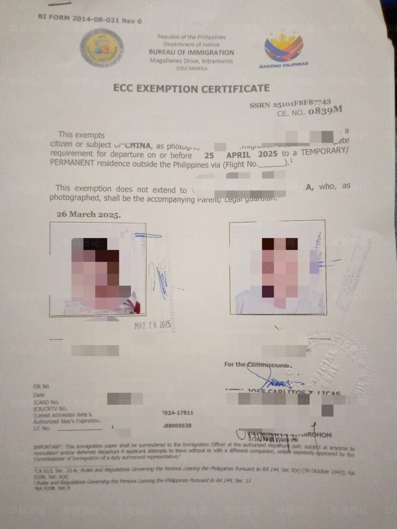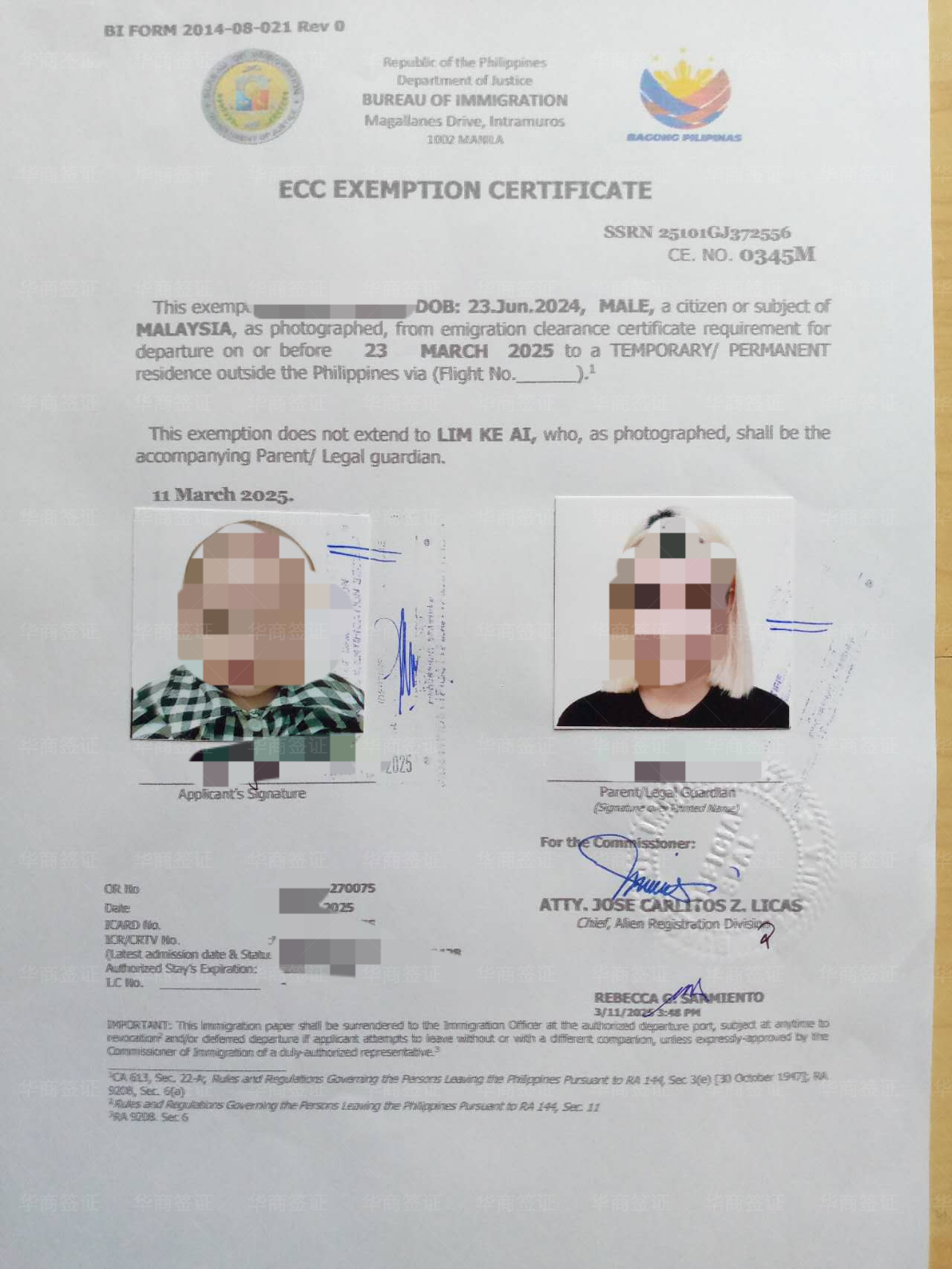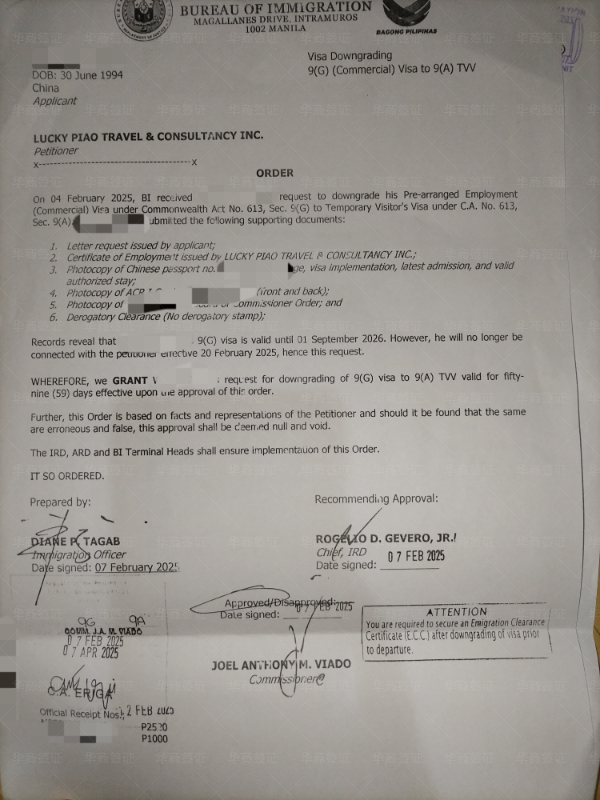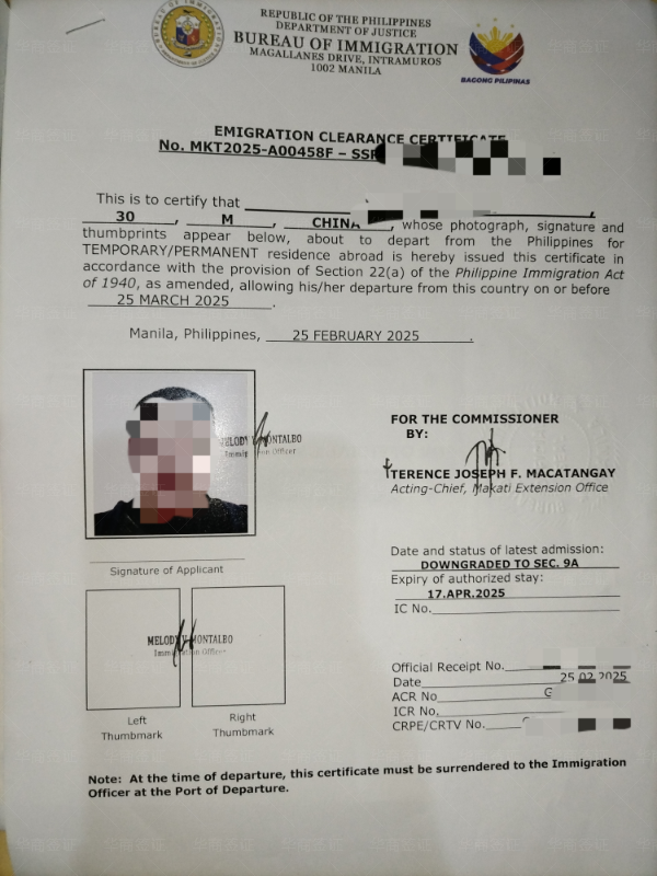 从入境以来大大小小的手续都找华商办的,从跟我老婆结婚、到我女儿出生、办无菲籍证明办护照、我老婆的菲律宾护照、去中国的签证,结婚证认证,都是找华商办的,我们现在办的是ECC要回国,出了就马上打包送到机场给我们了,一家人的证件手续都在这了;他们会跟你说办好这个签证回国会方便很多,之前我朋友也是带老婆孩子回国也是在华商这办的,他推荐给我的,说服务很周到甚至打车机票都能在这帮忙订,因为我们在菲的时候不在马尼拉所以找华商有些能不出面的就不用出面了,但有序必须出面的也是让华商帮我们订的机票去马尼拉,今天回国的机票也是找华商的现在就等起飞了