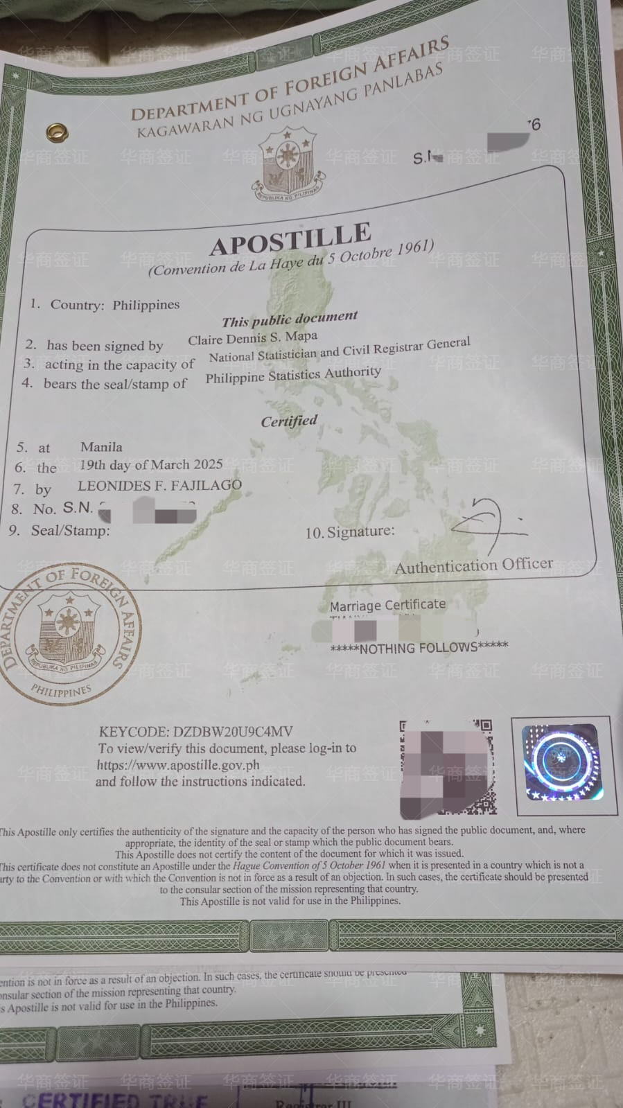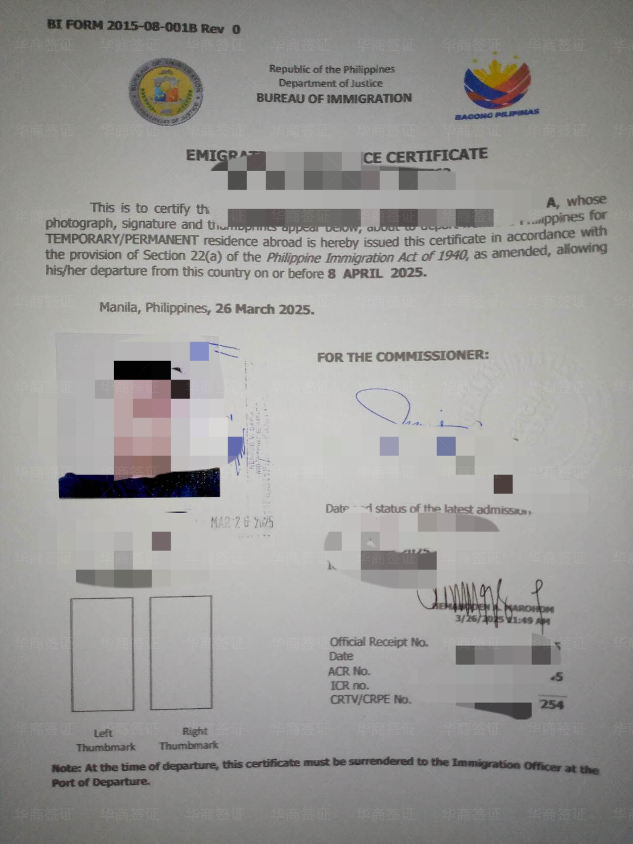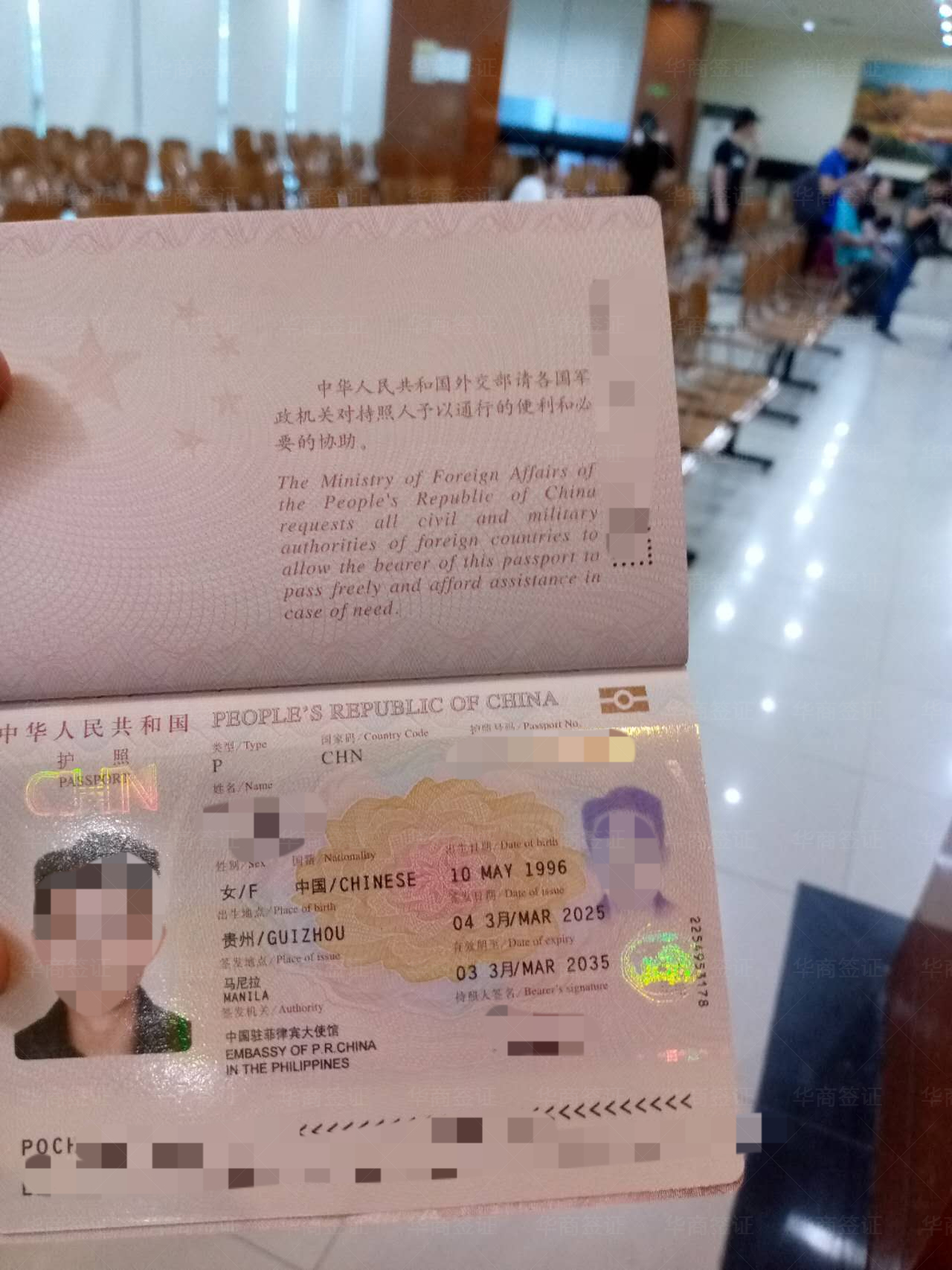 从入境以来大大小小的手续都找华商办的,从跟我老婆结婚、到我女儿出生、办无菲籍证明办护照、我老婆的菲律宾护照、去中国的签证,结婚证认证,都是找华商办的,我们现在办的是ECC要回国,出了就马上打包送到机场给我们了,一家人的证件手续都在这了;他们会跟你说办好这个签证回国会方便很多,之前我朋友也是带老婆孩子回国也是在华商这办的,他推荐给我的,说服务很周到甚至打车机票都能在这帮忙订,因为我们在菲的时候不在马尼拉所以找华商有些能不出面的就不用出面了,但有序必须出面的也是让华商帮我们订的机票去马尼拉,今天回国的机票也是找华商的现在就等起飞了