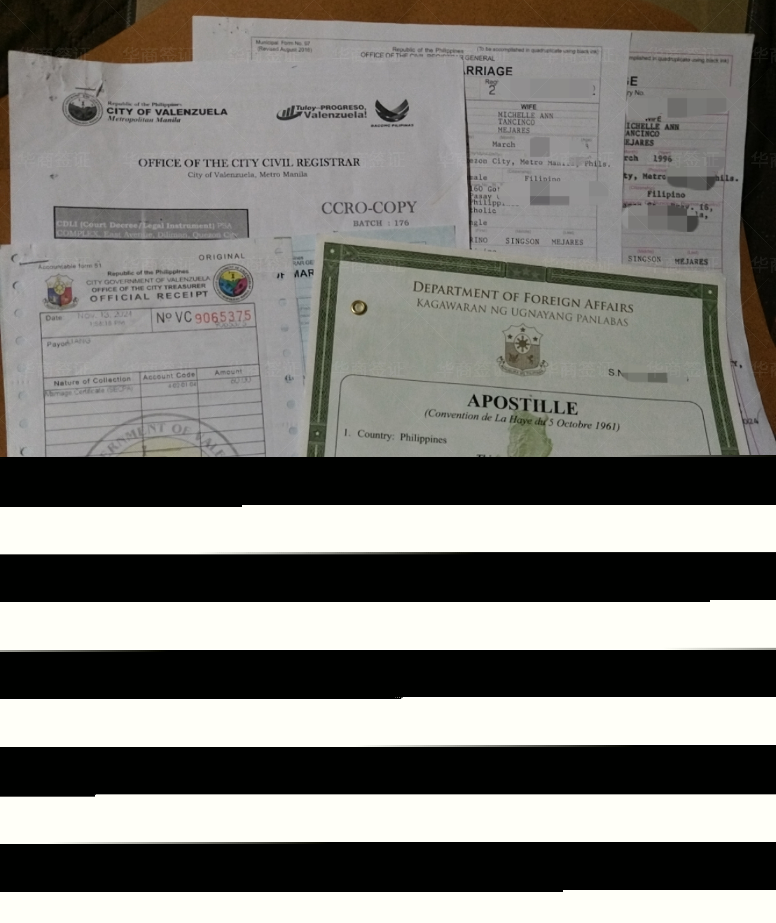 华商签证菲律宾业务包含: 续签,移民,租房,接机,工签,公司注册,结婚证,双认证、翻译,探亲签,补办护照/补办旅行证。部门涉及:外交部,移民局,警局,NBI,统计局,移民署,监狱,拘留所,律师所,机场,洗黑等100多个项目,都可以一条龙为您服务到底。