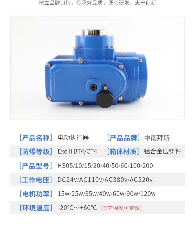 执行器,电动执行器90°120°180°270°旋转角行程扭力控制分为开关无源触点反馈型/智能调节型,特殊环境防爆、隔爆型。硬质铝合金壳体 执行电源DC24v 、AC220v、AC380v等可选。内置过热保护、中控反馈信号,指示器透视窗口,附带断电应急手动装置 防护等级IP67 底部安装尺寸符合ISO5211/DIN3337***际标准 适应环境温80℃,环氧树脂涂层。详细数据由供应商另行提供。
